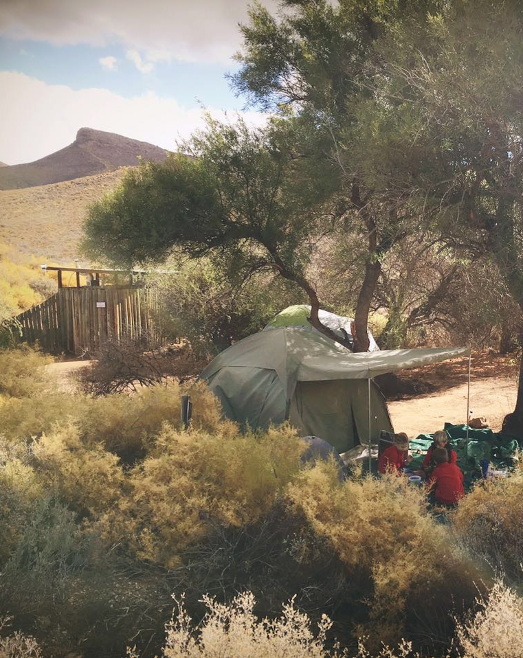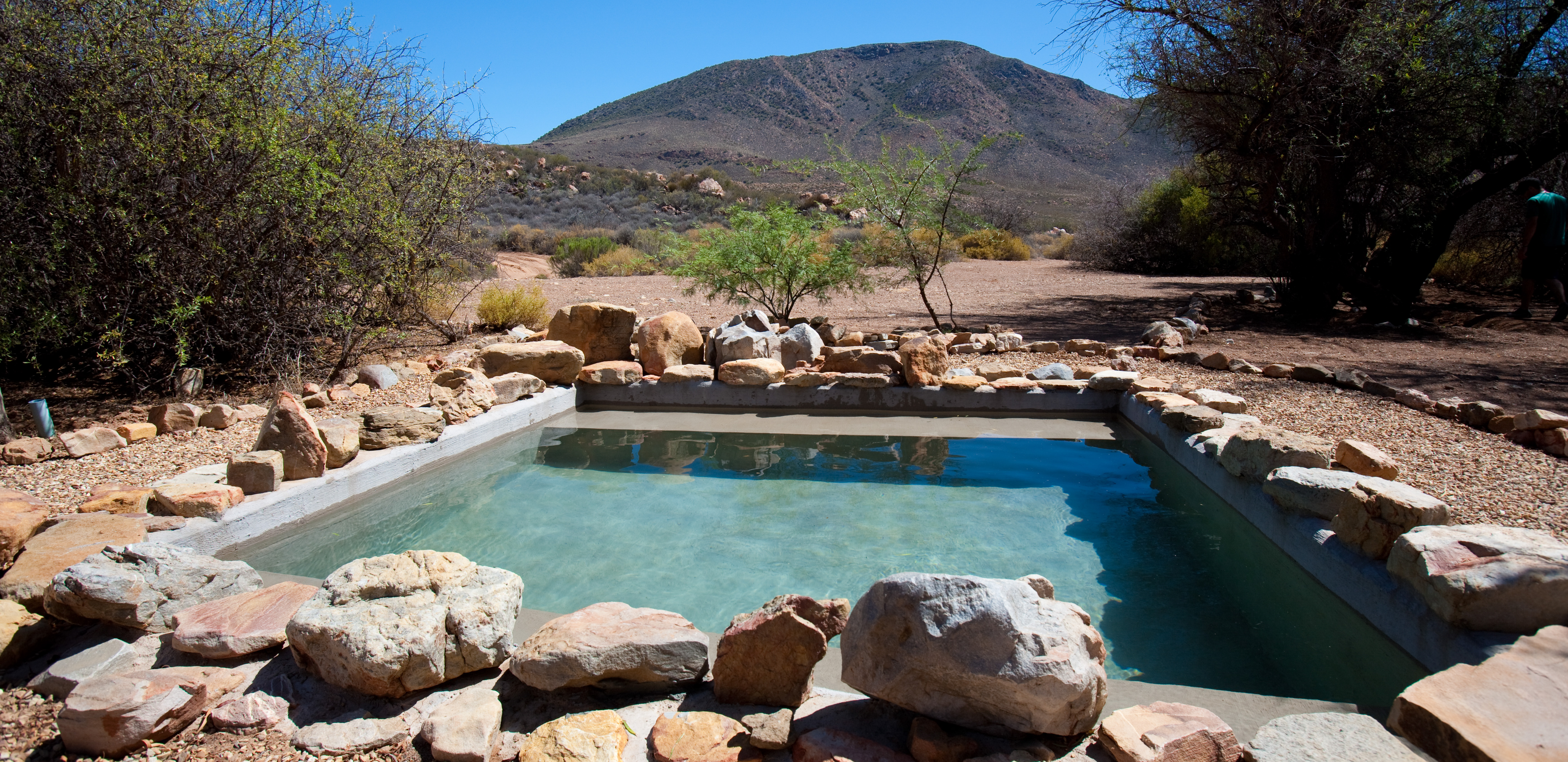 Situated under shady trees in an alluvial plain, this site is equipped with four toilets and four showers in two separate locations. The communal area has a generous kitchen, a central braai area with steel braai drums and grids. For those lazy Karoo days, there is a splash pool which is filled from Mid September to Mid April. There is ample space for up to 20 vehicles. The site is intended for properly equipped campers – there is no electricity supply or cell phone signal.